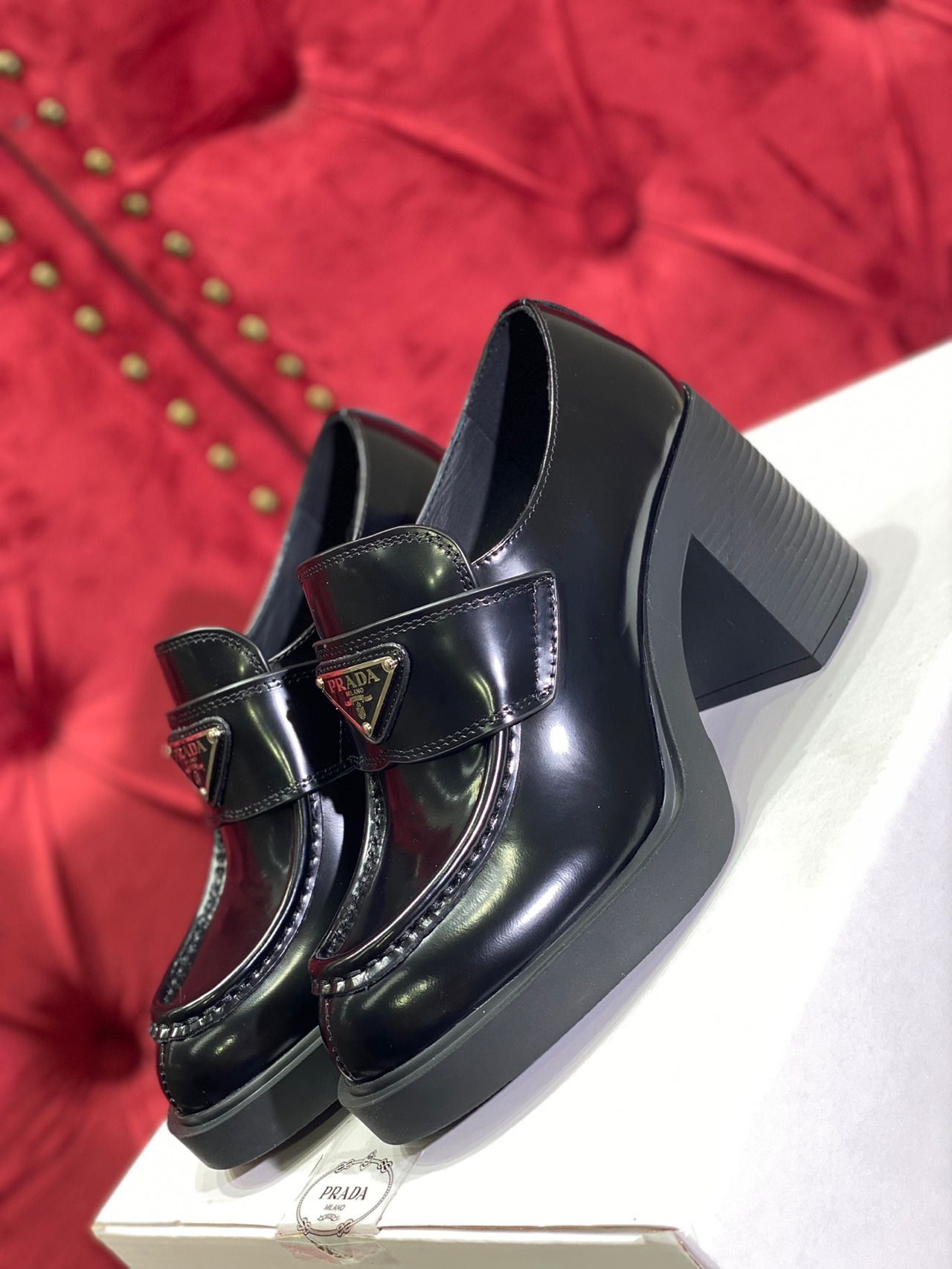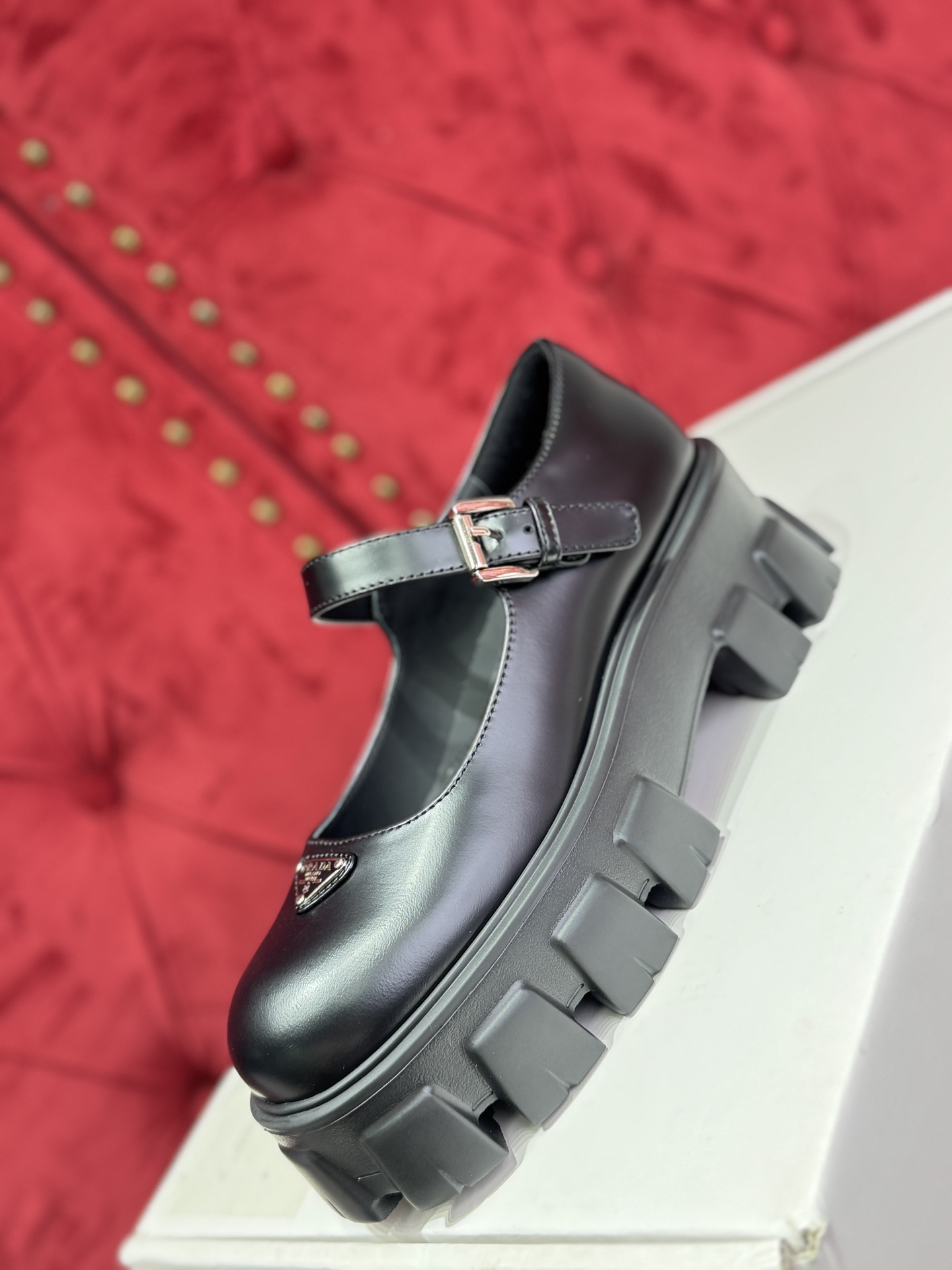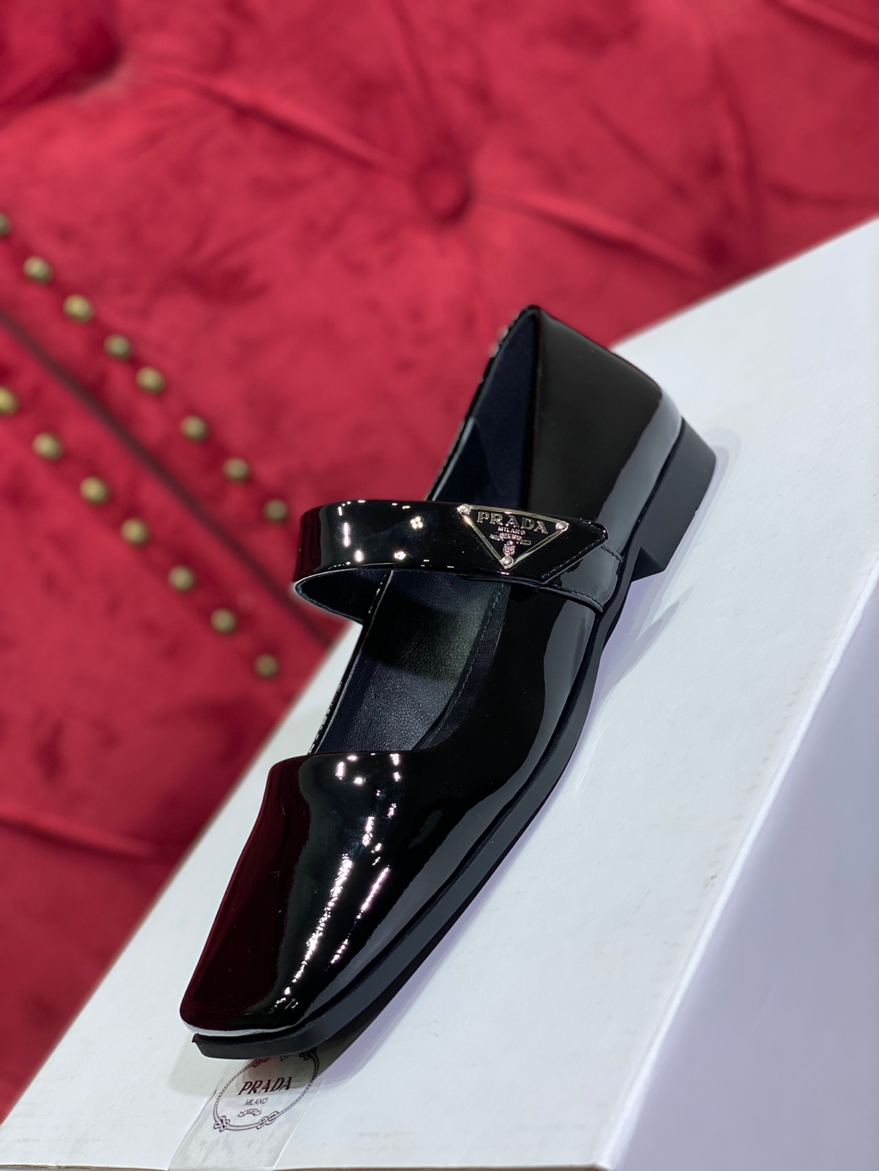 P 羊皮珐琅三角标粗跟玛丽珍单鞋